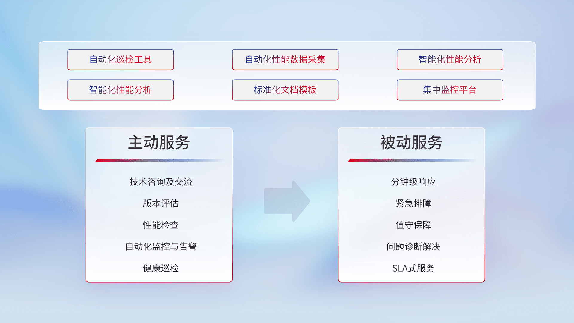 智能化工具和标准化文档,,保障服务质量,,提供主动服务(包含技术咨询、、、、版本评估、、性能检查、、自动化监控与告警、、、健康巡检)和被动服务包含(分钟级响应、、、、紧急排障、、值守保障、、、、问题诊断解决、、SLA服务)。。